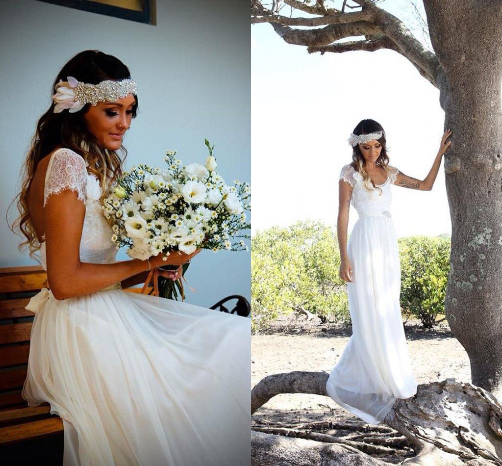 Discount Boho Vintage Ivory Lace Wedding Dresses 2017 Capped Sleeves Low Back Wedding Gowns For ...